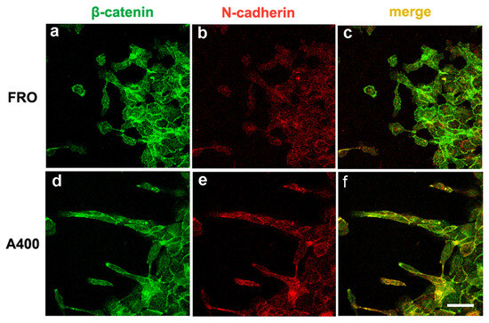 We noted that A400 cells showed an increased tendency with respect to FRO cells to separate from the edge of the cell sheet and migrate into the free space created by the wound, as shown in Figure 5 (panels d, e, f vs. a, b, c). These cells were heavily stained with VIM (Figure 5d) and FN (Figure 5e). On the contrary, FRO cells largely failed to separate from the edge of the wound and were poorly stained with VIM (Figure 5a) and FN (Figure 5b). In addition, when an F-actin stain was performed, migrating A400 cells showed large lamellipodia at the leading edge (Figure 5f, small arrows), features that, although present in FRO cells, were confined to few cells at the migrating front of the edge (Figure 5c). Moreover, migrating A400 cells were well stained with N-cadherin, often present at the leading edge of the cells (Figure 6e) and strongly co-localized with β-catenin (Figure 6f). On the contrary, FRO cells, at the edge of the wound, were poorly stained with N-cadherin (Figure 6b), and there was no overlap with β-catenin staining (Figure 6c). These results show a propensity of A400 cells to separate from the monolayer and migrate into the free space, and that precisely these cells were heavily stained with FN, VIM, and N-cadherin, showing lamellipodia at the leading edge. Of note, when we measured the rate of migration of the fronts of the wounds, we did not obtain clear differences between FRO and A400 cells. Thus, it appears that A400 cells show increased solitary cell migration but not increased collective cell migration.