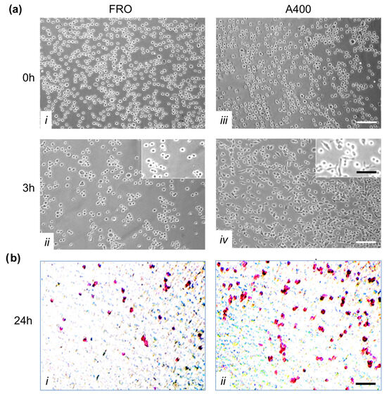 A crucial feature of cancer cells is their capability to invade neighboring tissues. We studied this characteristic first by evaluating adhesion to extracellular matrix proteins. To this end, we performed an adhesion assay in which FRO and A400 cells were seeded in plates coated with Matrigel. By three hours, A400 cells attached with high efficiency, unlike FRO cells (Figure 7a, panel iv vs. ii). Moreover, by three hours, several A400 cells were already spread (inset of panel iv), while FRO cells were still rounded (inset of panel ii).