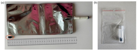 (a) Size comparison between porous carbon material (outlined in red) and a gas sampling bag; (b) collection vial.