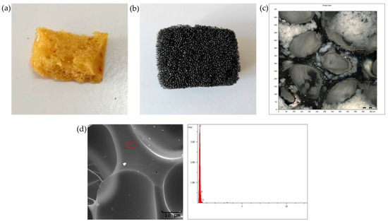 Porous material: (a) polyurethane base; (b) material after carbonization; (c) confocal microscopy image of the final material; (d) EDS elemental composition of the material after carbonization.