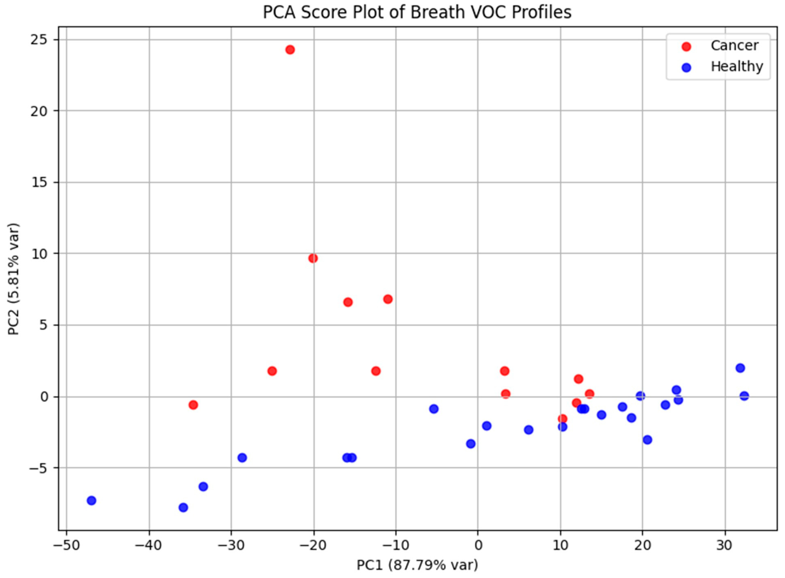 Principal Component Analysis was applied to explore the dataset’s structure and evaluate its capacity to discriminate between cohorts (Figure 6). The PCA score plot demonstrated apparent separation between laryngeal cancer patients and healthy controls, reflecting systematic differences in exhaled VOC profiles. PC1 and PC2 accounted for 87.79% and 5.81% of the total variance, respectively, highlighting that the majority of variance in the dataset is captured by the first principal component.