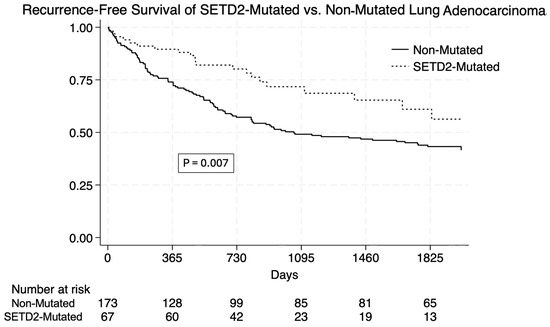 With the largest cohort to date, we describe the clinical characteristics and molecular profiles of SETD2-mutated lung adenocarcinoma from a large cohort of patients at a single institution. We also aim to elucidate the utility of SETD2 mutations for prognostication by comparing recurrence-free survival (RFS) in patients with and without this mutation.