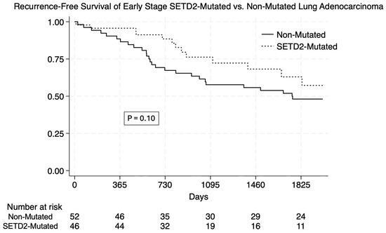 Kaplan–Meier plots of recurrence-free survival in patients with and without SETD2 mutation. In patients with early-stage (stages I and II) tumors, there was a trend towards improved recurrence-free survival, with long-rank test showing p = 0.10.