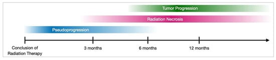 - Ellingson, B.M.; Chung, C.; Pope, W.B.; Boxerman, J.L.; Kaufmann, T.J. Pseudoprogression, radionecrosis, inflammation or true tumor progression? challenges associated with glioblastoma response assessment in an evolving therapeutic landscape. J. Neuro-Oncol. 2017, 134, 495–504. [Google Scholar] [CrossRef]
