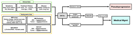 - Lee, D.; Riestenberg, R.A.; Haskell-Mendoza, A.; Bloch, O. Brain Metastasis Recurrence Versus Radiation Necrosis. Neurosurg. Clin. N. Am. 2020, 31, 575–587. [Google Scholar] [CrossRef] [PubMed]
