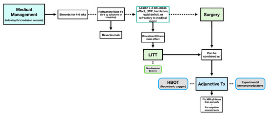 - Chung, C.; Bryant, A.; Brown, P.D. Interventions for the treatment of brain radionecrosis after radiotherapy or radiosurgery. Cochrane Database Syst. Rev. 2018, 7. [Google Scholar] [CrossRef] [PubMed] [PubMed Central]