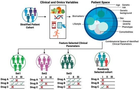 How clinical trial enrichment influences the success of clinical trials. Clinical trial enrichment is the process of recruiting prospective individuals who share similar clinical parameters and who are most likely to benefit from a trial drug. The figure illustrates how individuals grouped into a cohort influence the success of clinical trials (from Phases I to III) with drugs A, B, and C as trial drugs. In general, patients can be grouped into cohorts based on specific combinations of clinical parameters such as sex, race, ethnicity, family history, and lifestyle and omics profiles. Often a set of patients fail to respond to a therapeutic intervention, and the ability to distill the right combination of clinical parameters is key to determine clinical trial success. Only cohorts with the right combinations of clinical parameters enrich for likely responders, improving the probability of clinical trial success throughout clinical development. Figure generated with BioRender.