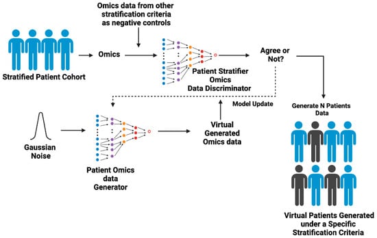 The goal of this component is to generate synthetic patient data to build a Patient Virtual Space (PVS) for modeling clinical parameters predictive of benefit from the trial drug. VP-GAI uses publicly available clinical and omics data as inputs for training (Figure 3). For the sake of simplicity, we consider transcriptomics data with well annotated clinical information (e.g., age, ethnic group, disease and medical history, genetic background, etc.) as input data. For example, for a trial drug to be tested on its therapeutic effects on breast cancer (BC), available transcriptomics data from BC patient cohorts will be used to train a VP-GAI model. On the other hand, transcriptomics data from other diseases will be used as negative training sets. Here, the discriminator of VP-GAI will learn the statistical distribution of gene expression activities of BC from other diseases. The performance of the discriminator can be evaluated via classification. On the other hand, the generator of VP-GAI aims to generate synthetic BC transcriptomics data that recapitulates the statistical distribution of clinical attributes in the training dataset. Gaussian noise (random noise) can be added to the input data and subjected to the discriminator to assess whether the generated data captures the statistical behavior of BC patients. At the beginning, the synthetic data generated by the generator is very much dissimilar to real BC patient data. However, through iterative learning and improving discrimination–generation procedure, the generator eventually generates synthetic data that conforms to the statistical distribution of attributes specific to BC patients. Once the generator has achieved the desired generative performance, various synthetic BC patient data can be generated to build a patient space for BC. At this stage, we have a generic VP-GAI with respect to a disease (breast cancer in this case). Starting with this generic VP-GAI model, using transfer learning with a similar discrimination–generation training process, the next phase is to build VP-GAI subpopulation models with respect to specific combinations of clinical parameters.