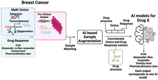 The goal of this component is to develop a GAI model that recapitulates response phenotypes with respect to a given drug (Figure 4). Multi-omics data (e.g., genomics, transcriptomics, proteomics, and epigenomics) of individual patients with matched response phenotype data correspond to a given drug, i.e., IC50 measured as a continuous variable or binned as “responder vs. non-responder” can be used as inputs to train a Drug AI model. Resources such as DrugBank [43], PubChem [44], Gene Expression Omnibus (GEO) [45], Cancer Cell Line Encyclopedia (CCLE) [46] and DepMap [46,47], Genomics of Drug Sensitivity in Cancer (GDSC) [48], and LINCS L1000 [49] can be used to enrich the input dataset. Whenever needed, a GAI approach like VP-GAI described above can be employed to augment the dataset for training. To increase the specificity of data that captures pharmacological behaviors of a drug, the input vector can be constructed by concatenating with molecular descriptors that describe the structure of the drug (e.g., SMILES, MOL, and SDF) together with omics data and response phenotype. Learning performance can be evaluated via classification or regression strategies. The resulting trained Drug AI model is generic, meaning given the chemical structure of a drug and omics data, the model outputs a drug-responsive phenotype. In other words, the goal of the Drug AI model is to predict response phenotypes (sensitive or resistant) or the extent of response (e.g., IC50) given a drug structure and omics data of an individual. Alternatively, one can also build drug class-specific AI models such as GPCR antagonists, which are expected to deliver greater specificity and performance than generic models.