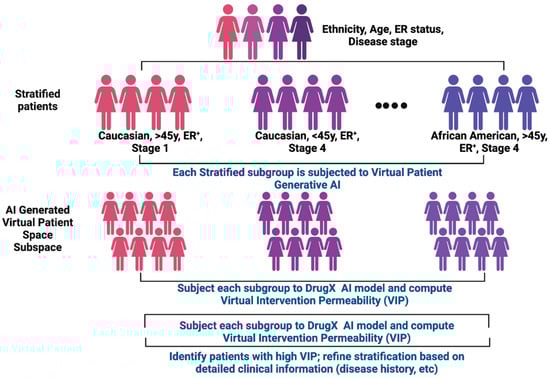 As for the Drug AI component, suppose drug X is the drug to be evaluated in a clinical trial. There are two key questions to be addressed: (i) Will drug X be effective in most if not all sub-cohorts? (ii) Will a specific patient subpopulation benefit more from drug X and thus demonstrate a high Virtual Intervention Permeability (VIP) score? Or vice versa? To address these questions, synthetic patient data generated from each cohort-dependent VP-GAI will be subjected to the Drug X AI model and the VIP score will be computed using over-representation analysis (ORA) approaches described above with respect to individual patients in each subpopulation. In this way, we can identify high VIP score sub-cohorts enriched with effective individuals. Because clinical parameter sets with respect to high VIP score subpopulations are known, this means cohorts for patients recruited based on these clinical parameters are most likely prospective individuals for drug X. The process of patient stratification described above can be repeated using other clinical parameters, such as presence of specific mutations or expression activities of specific genes that had been demonstrated to drive BC. Again, each cohort or sub-cohort will be subjected to VP-GAI and each of these virtual cohorts will be tested on the efficacy of drug X using the Drug AI modeling strategy. Based on the VIP scores, the drug modeling process will allow us to identify subpopulations with the right combinations of clinical parameters enriched with prospective individuals that will benefit the most from drug X.