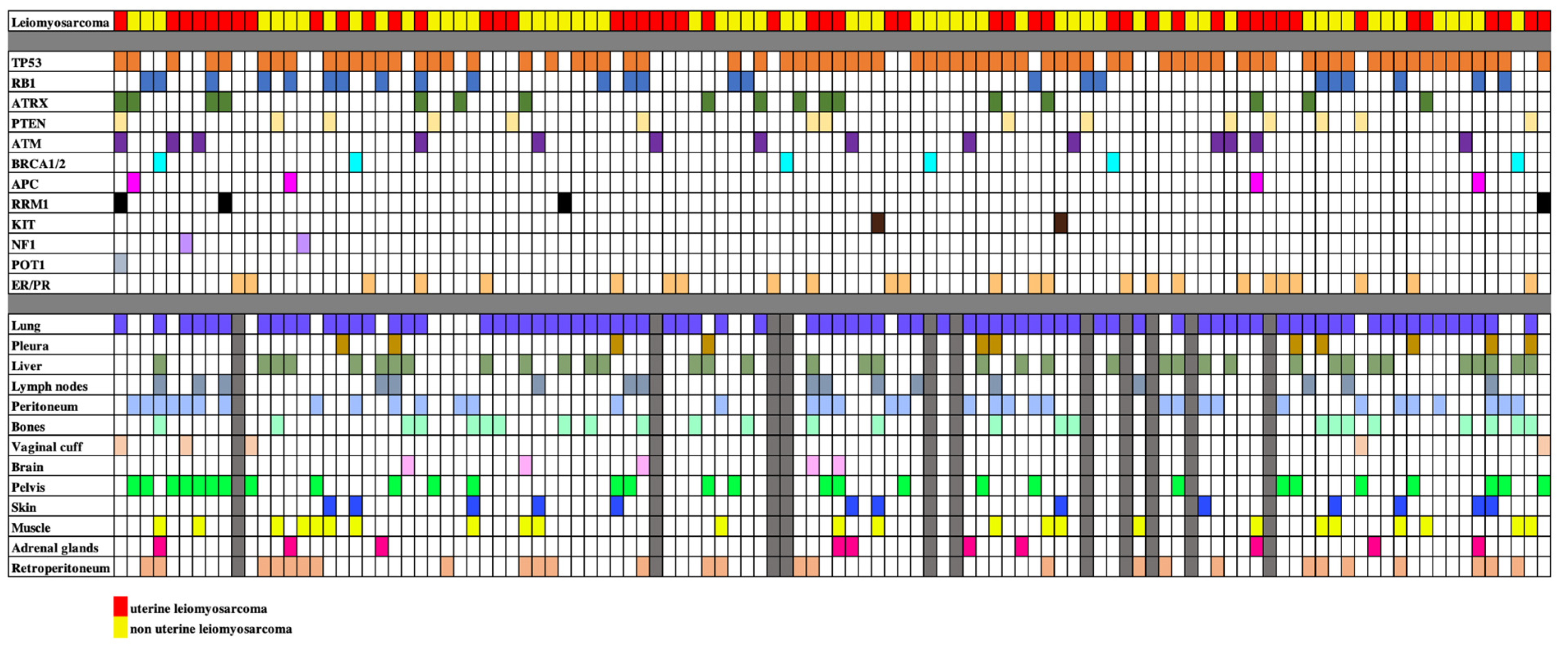 Pearce H, Chang Y-C, Metalonis SW, Rose BE, Jonczak EE, Subhawong T, D’Amato G, Grossman J, Castillo P, Huang M, et al. Tumor Genomics, Metastatic Patterns, and Prognosis in Leiomyosarcoma: A Single-Center Retrospective Cohort Study. Cancers. 2025; 17(21):3544. https://doi.org/10.3390/cancers17213544