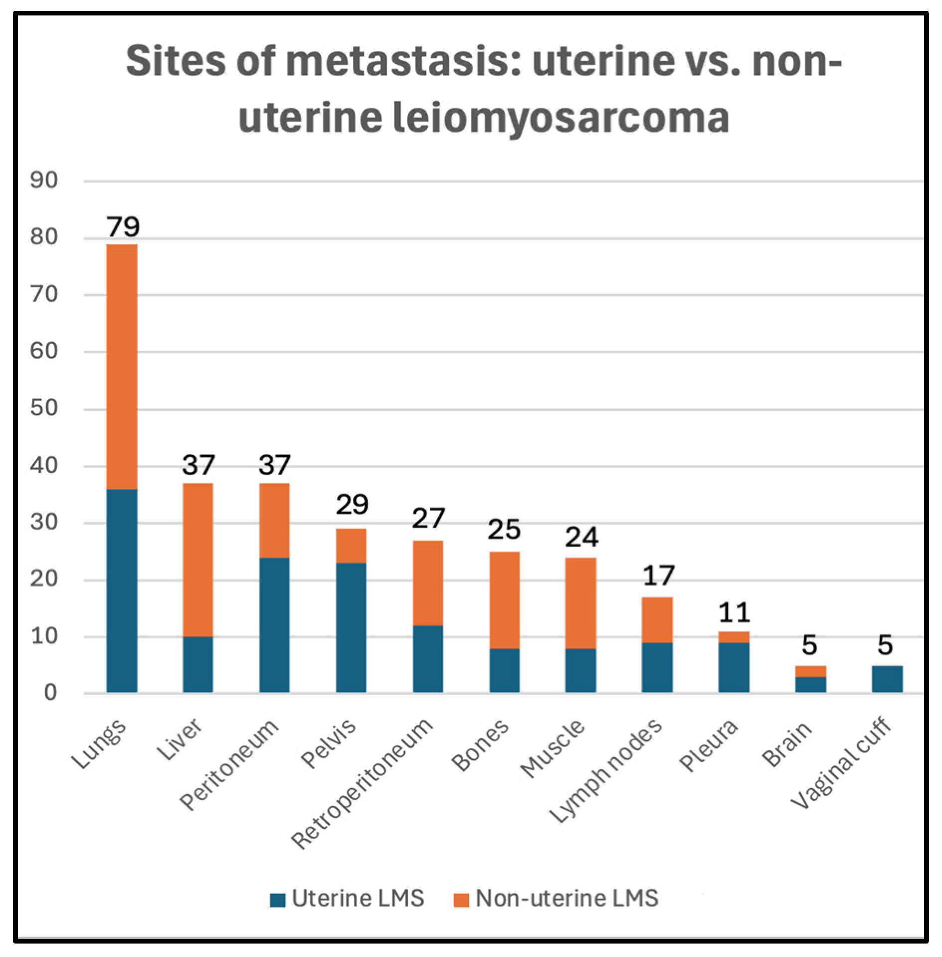 - LiBrizzi, C.L.; Vankara, A.; Meyer, C.F.; Levin, A.S.; Morris, C.D. Bone Metastases in Patients with Leiomyosarcoma: A Retrospective Analysis of Survival and Surgical Management. Sarcoma 2022, 2022, 6806932. [Google Scholar] [CrossRef] [PubMed]