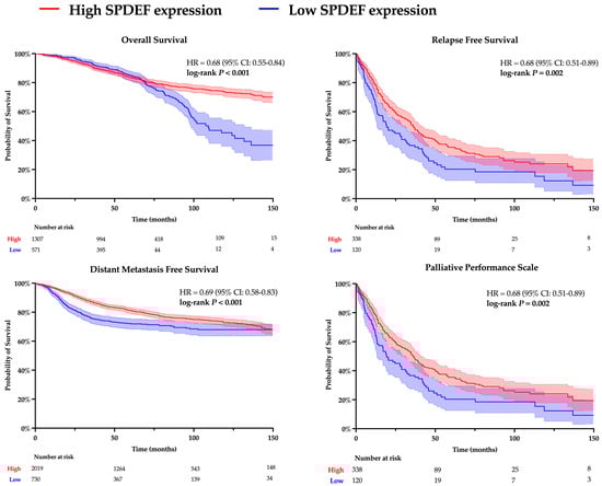 Kaplan–Meier analyses for overall survival (OS), relapse-free survival (RFS), distant metastasis-free survival (DMFS), and palliative performance scale (PPS) were conducted to evaluate the relationship between SPDEF expression and clinicopathological outcomes. Results are depicted in Figure 1. Patients with higher SPDEF expression consistently exhibited superior outcomes compared to those with low expression (OS: HR = 0.68, RFS: HR = 0.68, DMFS: HR = 0.69, PPS: HR = 0.68; all p < 0.01). These findings indicate a strong directional association wherein loss of SPDEF expression correlates with poorer short and long-term prognosis. Of note, RFS, DMFS, and PPS demonstrated consistently inferior outcomes in patients with low SPDEF expression through the analyzed timeframe, suggesting short- and long-term impacts on morbidity. In contrast, a stark difference in overall survival emerged around 80 months of follow-up, indicating a more long-term mortality association.