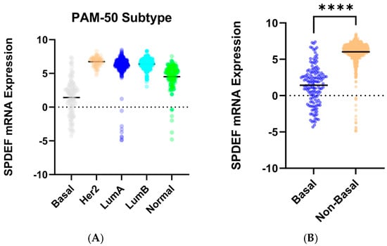 Our results are consistent with previous studies reporting tumor-suppressive properties of SPDEF in cancers of the prostate, colon, and head and neck, where its loss was found to contribute to more aggressive disease phenotypes [,,,,]. In contrast, other reports have suggested oncogenic activity of SPDEF [,,,], underscoring the context-dependent nature of SPDEF’s function across and within cancer types. Within the realm of breast cancer, our results align more closely with those observing anti-oncogenic effects of SPDEF, suggesting that SPDEF loss in breast tissue promotes progression, particularly in aggressive tumor subtypes.
