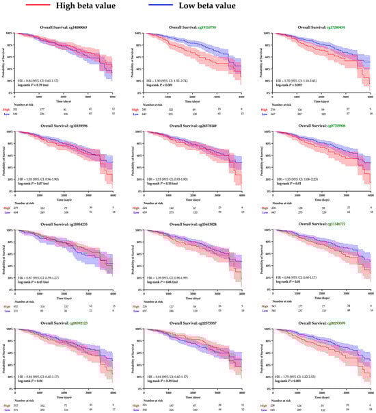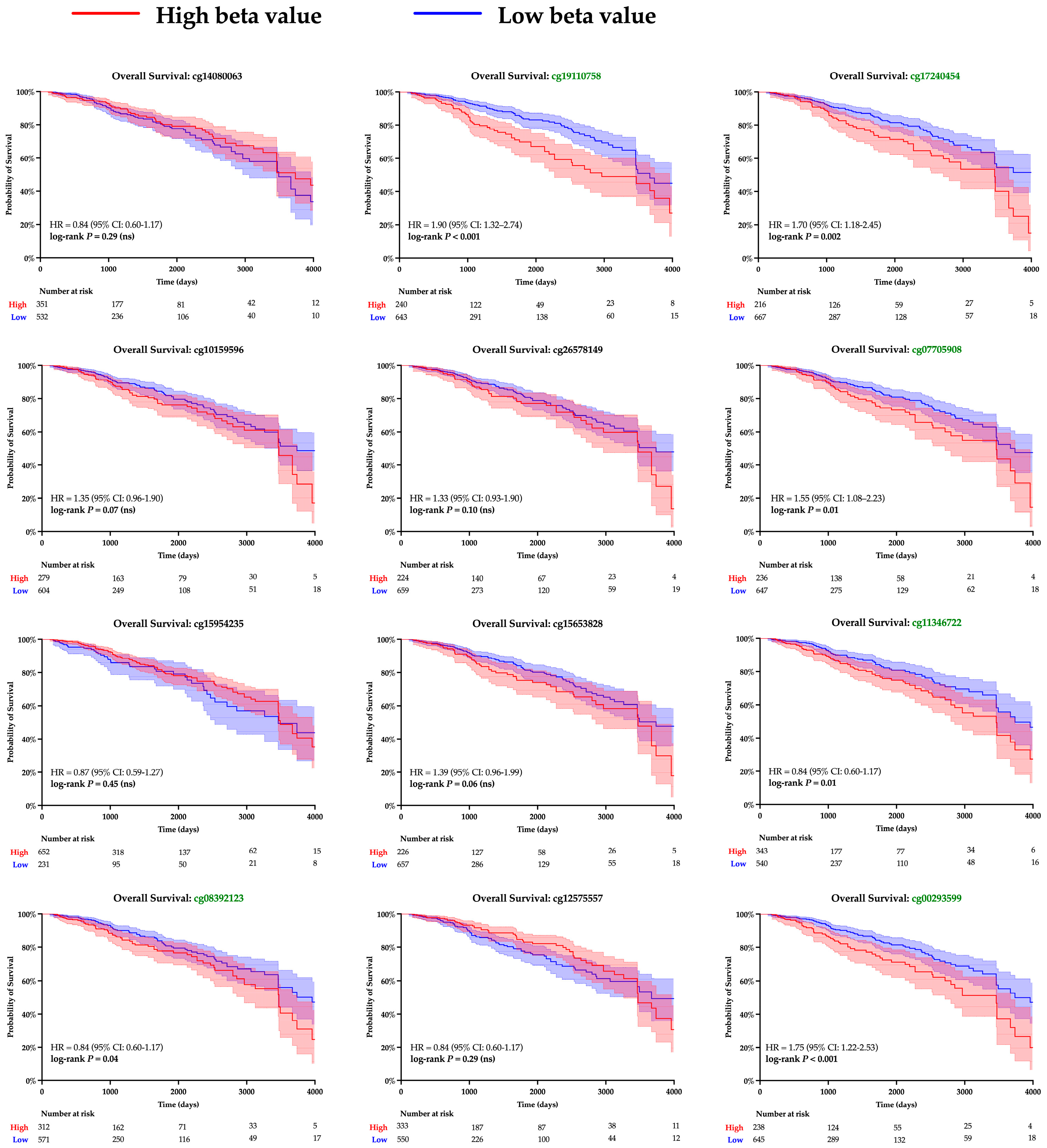 Kaplan–Meier survival analysis of SPDEF promoter methylation at CpG islands. Kaplan–Meier survival curves are shown for patients with tumors stratified into higher (red) and lower (blue) levels of methylation at each CpG island within the SPDEF promoter. Methylation was quantified with beta values, and loci with significant log-rank p-values are demarked with green font. 95% confidence intervals are shaded around both curves, and the number of patients remaining at risk is included beneath each respective X-axis.