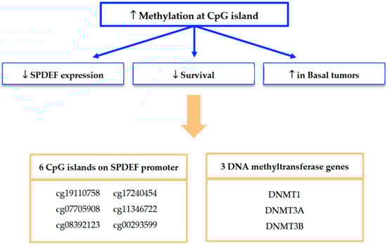 Mechanistically, our findings strongly implicate promoter methylation as a key driver of SPDEF silencing. A summary of our methylation analyses and framework for interpretation is depicted in Figure 7. Methylation at seven of the twelve CpG islands along the SPDEF promoter was found to inversely correlate with SPDEF expression. Six of these CpG islands additionally exhibited correlation with inferior breast cancer survival as well as elevated methylation in Basal tumors. Increased methylation among these Basal tumors suggests an epigenetically mediated mechanism contributing to aggressive disease biology. Additionally, the concurrent overexpression of DNMT1, DNMT3A, DNMT3B, and DNMT3L in low-SPDEF tumors reinforces the role of DNA methyltransferases in maintaining hypermethylation states. This is consistent with prior evidence that DNMT-mediated methylation orchestrates silencing of tumor suppressor genes and promotes oncogenesis [,,].