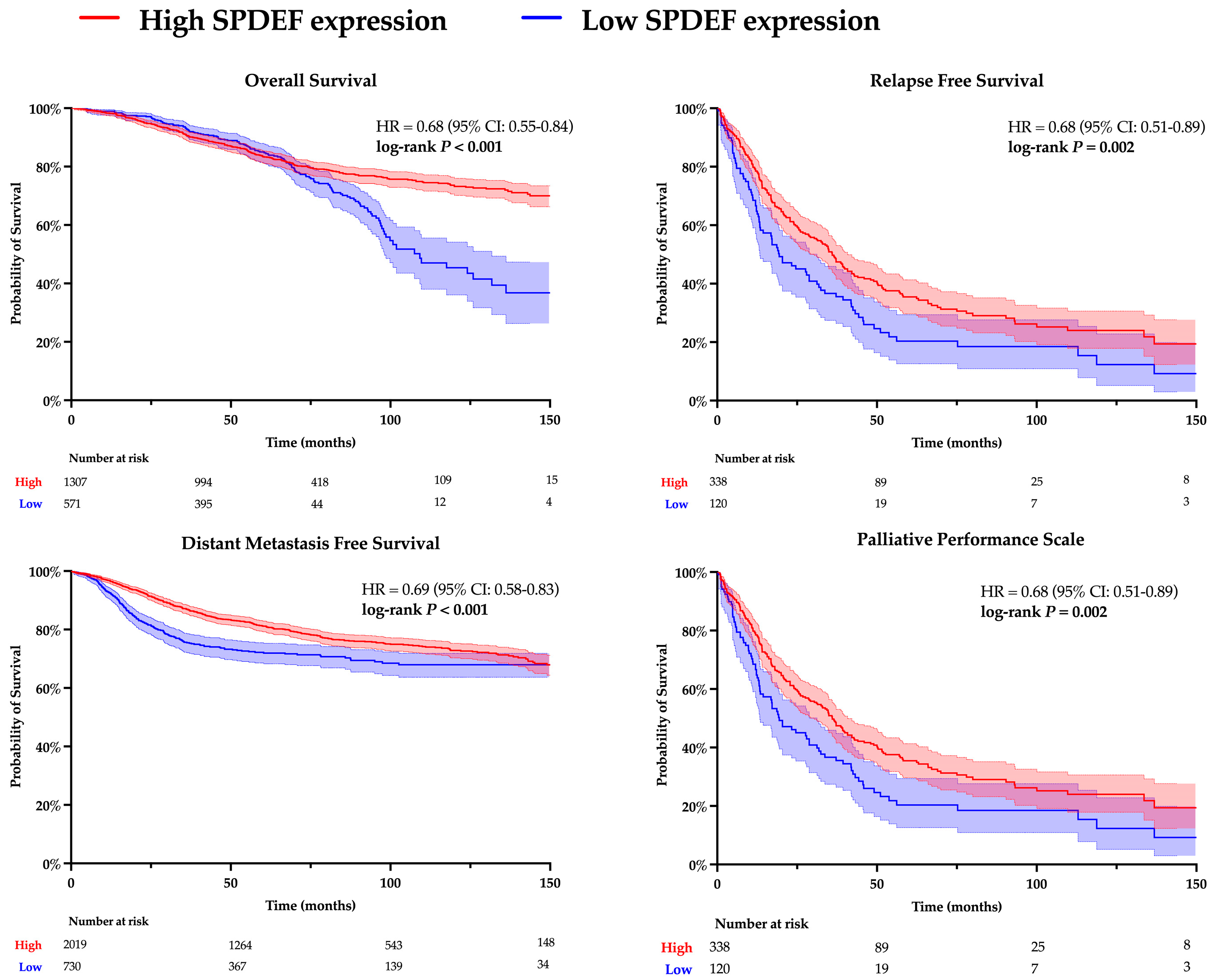 Kaplan–Meier analysis comparing high and low SPDEF expression groups. Patients were dichotomized into higher SPDEF expression (red) and lower SPDEF expression (blue) groups. Curves represent estimated probability over time with shaded 95% confidence intervals for overall survival, relapse-free survival, distant metastasis-free survival, and palliative performance scale. Hazard ratios (HR) with 95% confidence intervals and log-rank p-values are displayed within each panel. The number of patients remaining at risk is shown below the X-axis.