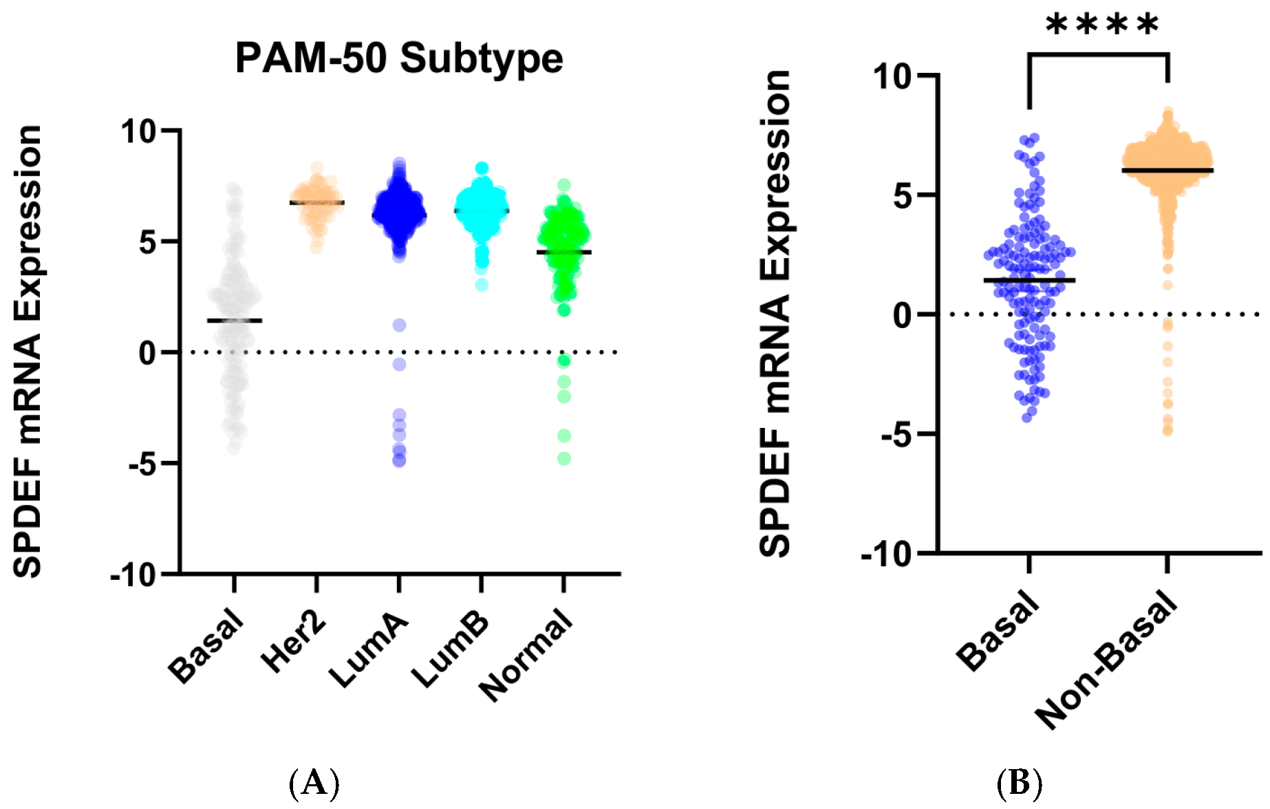 SPDEF mRNA expression across intrinsic breast cancer subtypes. (A) displays SPDEF expression values stratified by PAM-50 subtype (Basal, Her2-enriched, Luminal A, Luminal B, and Normal). Each dot represents an individual tumor, and horizontal black bars denote mean expression within each subtype. (B) compares Basal tumors to a pooled Non-Basal group (Her2-enriched, Luminal A, Luminal B, and Normal). Basal tumors demonstrate significantly reduced SPDEF expression compared to Non-Basal tumors (p < 0.001), which is indicated with asterisks.