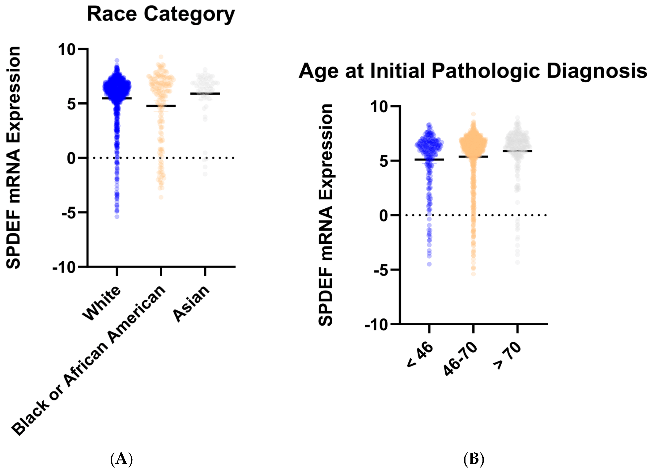 SPDEF mRNA expression stratified by demographic features. (A) depicts SPDEF expression across self-reported race categories (White, Black or African American, Asian). (B) depicts SPDEF expression amongst three categories of age at initial pathologic diagnosis (<46 years, 46–70 years, >70 years). Each dot represents a patient, and horizontal black bars denote mean SPDEF expression within each demographic category.
