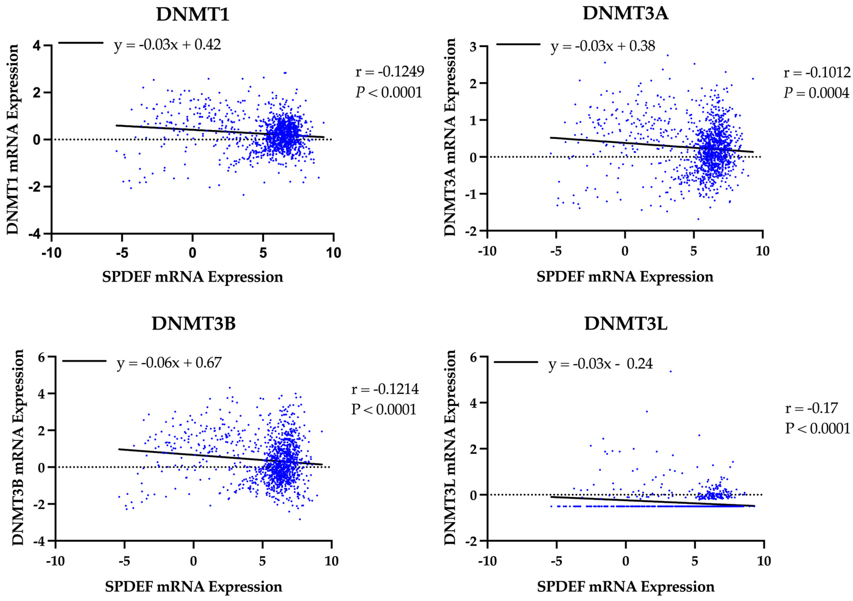 Correlation of SPDEF expression with DNA methyltransferase expression. Scatterplots display the relationship between SPDEF expression and DNMT1, DNMT3A, DNMT3B, and DNMT3L across all tumor samples. Lines of best-fit are included. Pearson correlation coefficients (r) and p-values are indicated.