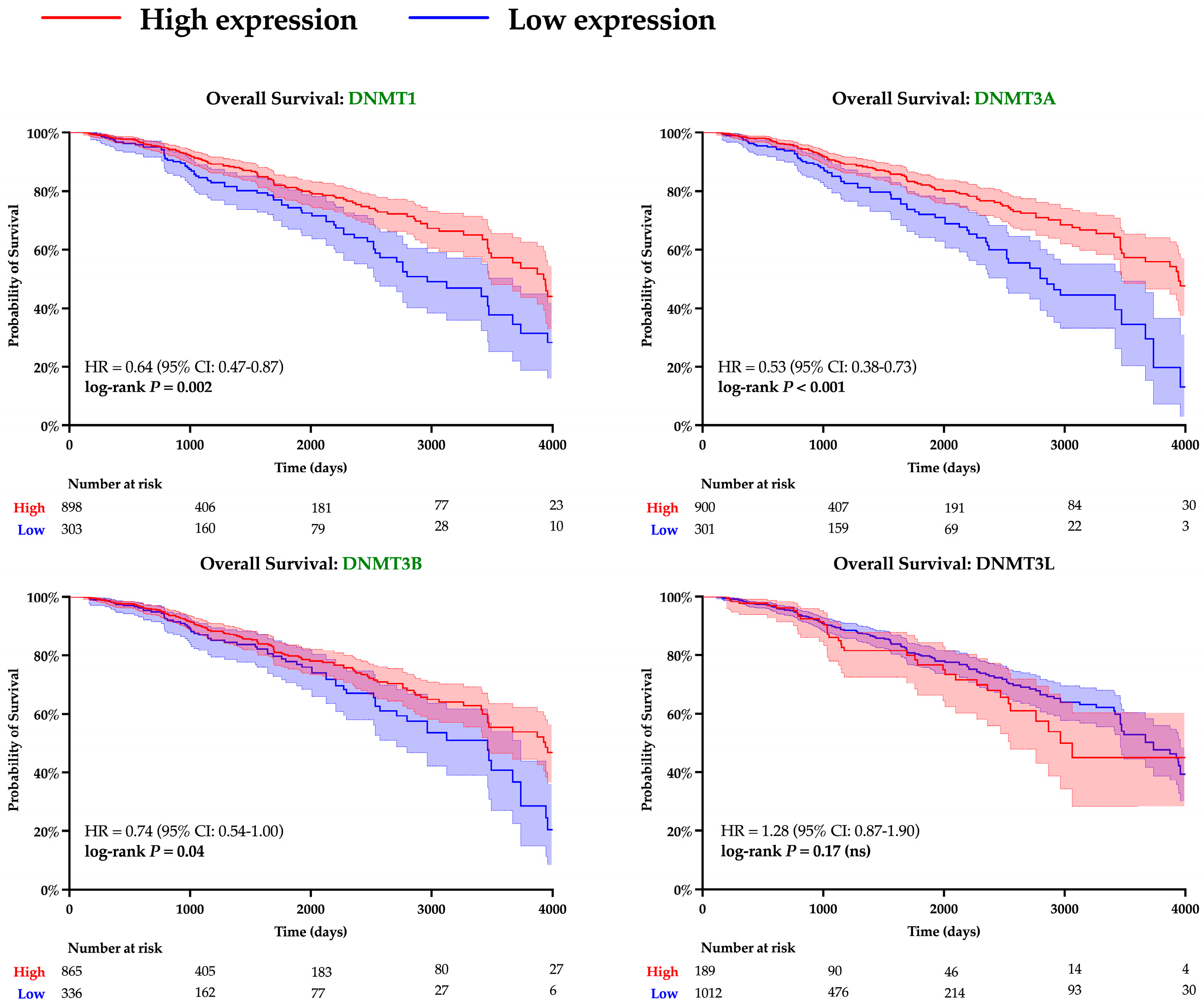 Kaplan–Meier survival analysis of DNMT expression. Survival curves are shown for patients with tumors stratified into high (red) and low (blue) levels of expression of various DNMTs. Statistical differences in hazard were computed with log-rank testing, and curves with significant p-values are denoted with green font. Shading around each curve represents 95% confidence intervals, and number of patients remaining at risk is depicted for each cohort beneath X-axes.