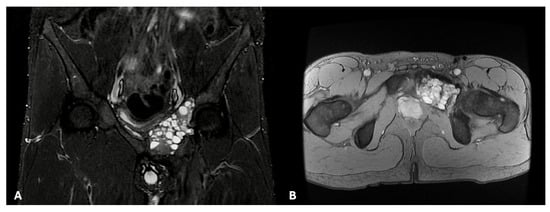 Coronal ((A); STIR sequence) and axial ((B); MRGE sequence) views of a desmoplastic fibroma of the right pubis and iliopubic branch. In both images, the lesion presents a multi-cystic appearance.