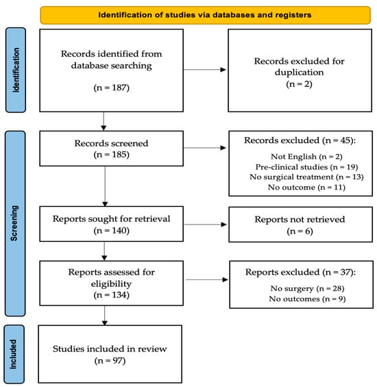 All articles were initially screened for relevance by title and abstract, excluding articles without an abstract, and obtaining the full-text article if the abstract did not allow the investigators to assess the presence of inclusion and exclusion criteria. Considering the limited number of large-sized case series articles and the low level of evidence in the few available, we included in our study articles ranging from Level I to Level V, as well as detailed case reports. The search algorithm, as outlined in the PRISMA guidelines, is presented in Figure 2. The review was not registered.