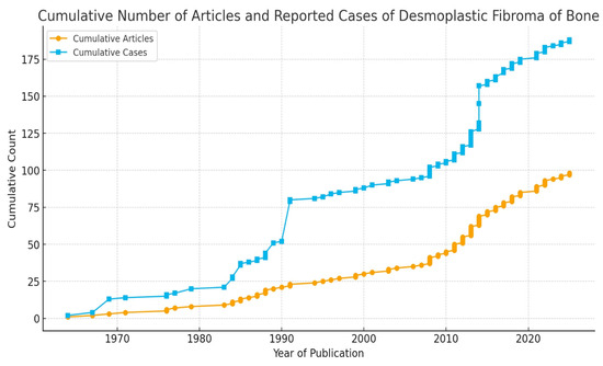 Since its discovery as a distinct pathology in the late 1950s, desmoplastic fibromas have been considered among the rarest benign tumors arising from bone tissue [1,2,3]. The number of desmoplastic fibromas reported in the literature has been estimated at hundreds. Our review confirms this perception, as only 187 cases of desmoplastic fibroma met our inclusion criteria [1,3,5,7,11,12,13,14,15,16,17,18,20,21,22,23,30,31,32,33,34,35,36,37,38,39,40,41,42,43,44,45,46,47,48,49,50,51,52,53,54,55,56,57,58,59,60,61,62,63,64,65,66,67,68,69,70,71,72,73,74,75,76,77,78,79,80,81,82,83,84,85,86,87,88,89,90,91,92,93,94,95,96,97,98,99,100,101,102,103,104,105,106,107,108]. Over 67 years, only 18 case series with information on their surgical treatment and postoperative follow-up have been identified [1,3,5,13,17,30,31,32,33,34,35,36,37,38,39,40,41]. The most numerous, with 27 cases, was published by Inwards et al. back in 1991 [30]. Only two other series included more than 10 cases [3,29], and 11 of them reported on only two or three patients [1,5,13,17,32,33,34,35,36,37,38,39,40,41]. The remaining evidence in modern literature comes from case reports. A total of 79 cases, accounting for 42.5% of the cases in our study, came from case reports [7,11,12,14,15,16,18,20,21,22,23,42,43,44,45,46,47,48,49,50,51,52,53,54,55,56,57,58,59,60,61,62,63,64,65,66,67,68,69,70,71,72,73,74,75,76,77,78,79,80,81,82,83,84,85,86,87,88,89,90,91,92,93,94,95,96,97,98,99,100,101,102,103,104,105,106,107,108]. A summary of the fragmented literature was necessary for an in-depth analysis of the epidemiology, clinical presentation, surgical treatments, and oncological outcomes of desmoplastic fibromas after surgery.