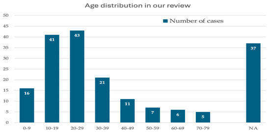 A total of 187 cases, 104 males (55.8%) and 83 females (44.2%), were included in our analysis. A binomial test did not reveal a statistically significant gender discrepancy among the evaluated patients (p = 0.5266). Patients’ mean age was 24.3 (2–79). The second and third decades of life were the most common at diagnosis (Figure 4) [1,3,5,7,11,12,13,14,15,16,17,18,20,21,22,23,30,31,32,33,34,35,36,37,38,39,40,41,42,43,44,45,46,47,48,49,50,51,52,53,54,55,56,57,58,59,60,61,62,63,64,65,66,67,68,69,70,71,72,73,74,75,76,77,78,79,80,81,82,83,84,85,86,87,88,89,90,91,92,93,94,95,96,97,98,99,100,101,102,103,104,105,106,107,108].