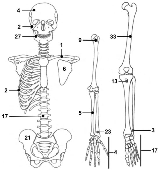 None of the evaluated patients had been diagnosed with multifocal desmoplastic fibromas. The lower limb was the most involved body area, accounting for a total of 87 desmoplastic fibromas (47%) [1,3,5,7,12,13,16,17,18,19,20,21,22,23,30,32,33,34,35,37,40,44,45,47,50,52,54,56,58,59,62,63,66,69,70,72,74,76,77,78,79,80,100,101,102,108]. The femur was the most affected single bone, as it alone was the location of 33 lesions (18%) [1,3,5,12,13,16,17,19,21,23,30,32,33,34,35,37,45,52,57,63,66,70,74,77,108]. Forty-eight lesions (26%) were located in the upper limb [1,3,5,11,13,15,17,20,30,32,33,34,35,36,39,42,46,48,51,53,55,64,65,67,73,81,89,92,93,94,96,104,105]. The mandible was the second most involved bone, with 27 lesions (14%) [14,30,33,35,40,43,68,83,84,86,87,88,90,96,97,100,103]. A total of 17 cases (9%) were documented with desmoplastic fibromas in their spine [31,38,49,60,75]. Finally, six lesions (3%) were localized in patients’ skull bones, including the zygoma [30,91,98,106], while the ribs were the site of two more neoplasms (1%) [82,102]. The distribution of desmoplastic fibromas in our study is graphically summarized in Figure 5.