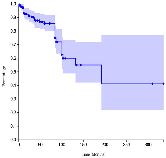 The post-operative follow-up was exhaustively described in 171 of 187 cases. Their mean post-operative follow-up was 65.3 months (6–336) [1,3,5,7,11,13,14,15,16,17,18,21,22,23,30,31,32,33,34,35,36,37,38,39,40,41,42,43,44,45,46,47,48,49,50,51,52,53,54,55,58,59,61,62,63,64,65,66,67,68,69,70,72,73,74,75,76,78,79,80,81,84,86,87,88,89,90,91,92,93,94,95,97,98,99,100,101,102,103,104,105,106,108]. Among them, 37 patients experienced local recurrences, resulting in an overall estimated recurrence rate of 21.6% [3,13,14,15,17,21,30,31,32,33,38,42,48,59,64,65,74,75,84,87,88,100]. The Kaplan–Meier curve of cumulative data in our review is pictured in Figure 6.