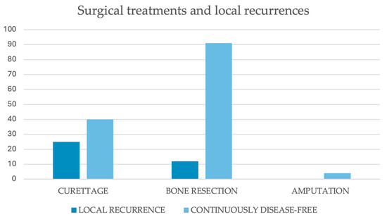 The surgical treatment of choice was intralesional curettage in 70 cases [1,3,5,7,12,13,16,17,19,20,30,31,32,33,34,35,36,37,38,39,40,41,42,45,51,55,57,64,66,68,69,72,74,80,86,87,92,96,100,108]. Wider resections were performed in 112 cases [1,3,5,11,14,15,18,21,22,23,30,31,32,33,34,35,36,37,38,39,40,41,43,44,46,47,48,49,50,52,53,54,56,58,59,60,61,62,63,65,67,70,71,73,75,76,77,78,79,81,82,83,84,85,88,89,90,91,93,94,95,97,98,99,101,102,103,104,105,106,107]. Amputations were carried out in 4 patients, all with large acral lesions of the upper or lower limb [3,34,39,54]. Finally, one case within a case series did not receive surgical treatment, but was included in our dataset as it could not be identified within the series [30]. A schematic resume of all the surgical approaches and eventual reconstructions included in our study is displayed in Table 3.