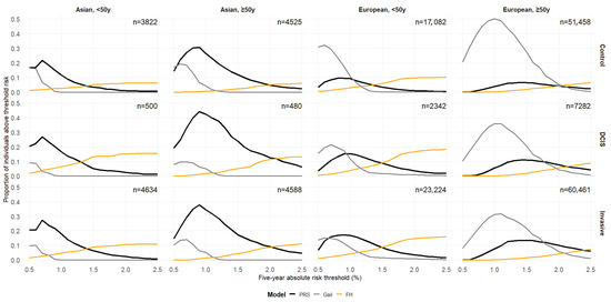 This study aims to evaluate the performance of genetic (PRS) and non-genetic (Gail) breast cancer risk predictors in identifying high-risk individuals across different age groups (<50 years and ≥50 years) and ancestries (Asian and European). By examining the proportion of individuals identified as high risk by these factors across various risk thresholds (five-year absolute risk 0.5–2.5%), we seek to determine how well each predictor performs in diverse populations and age groups.