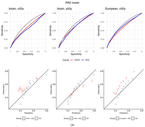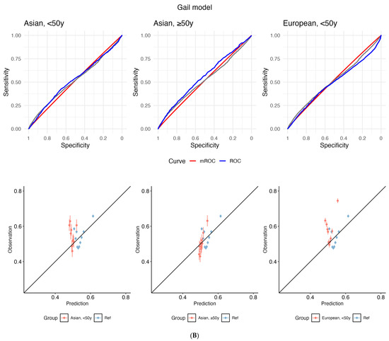 Receiver operating characteristic (ROC) curves (top panel) and calibration plots (bottom) for (A) polygenic risk score (PRS) and (B) the Gail model. The grey line depicts the empirical ROC of the reference population: European, ≥50 years). The model-based ROC (mROC) curve (red) depicts the ROC performance expected if the prediction model is perfectly calibrated in the external population (i.e., European, <50 years; Asian, ≥50 years; Asian, <50 years). The empirical ROC curve (blue) shows discrimination based on observed outcomes. Alignment between red and blue curves implies good calibration; divergence suggests miscalibration after accounting for case mix. Calibration plots are used to assess the agreement between predictions and observations in different percentiles of the predicted values. The black diagonal line represents ideal calibration, where the predicted probabilities match the observed frequencies. Deviations from this diagonal line indicate either overconfidence or underconfidence in the model’s predictions. y: years.