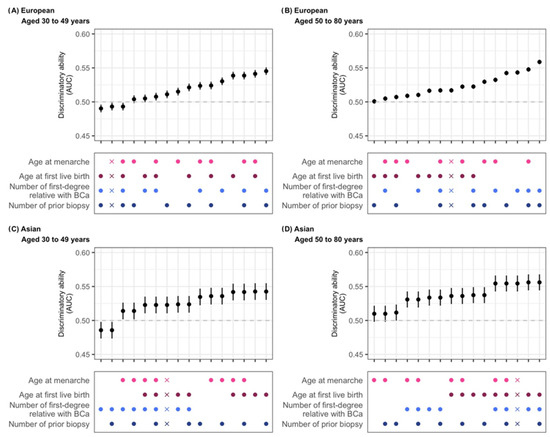 Discriminatory ability of risk factor combinations in the Gail model. Five-year absolute risk was calculated using the R package “BCRA” and used to predict the risk of invasive breast cancer in a case–control study. Grey dashed line: AUC=0.5, model performs no better than random chance. Dots represent risk factors included in the model (factors not considered are set to missing), and X indicates the model with all risk factors with the addition of atypical hyperplasia. European: women of European ancestry; Asian: women of Asian ancestry. As data on prior biopsies were unavailable for Asian-ancestry participants, retaining this variable in the model produced the same effect as assuming all participants of Asian ancestry had missing values for this variable (i.e., lowest-risk group assigned by default).