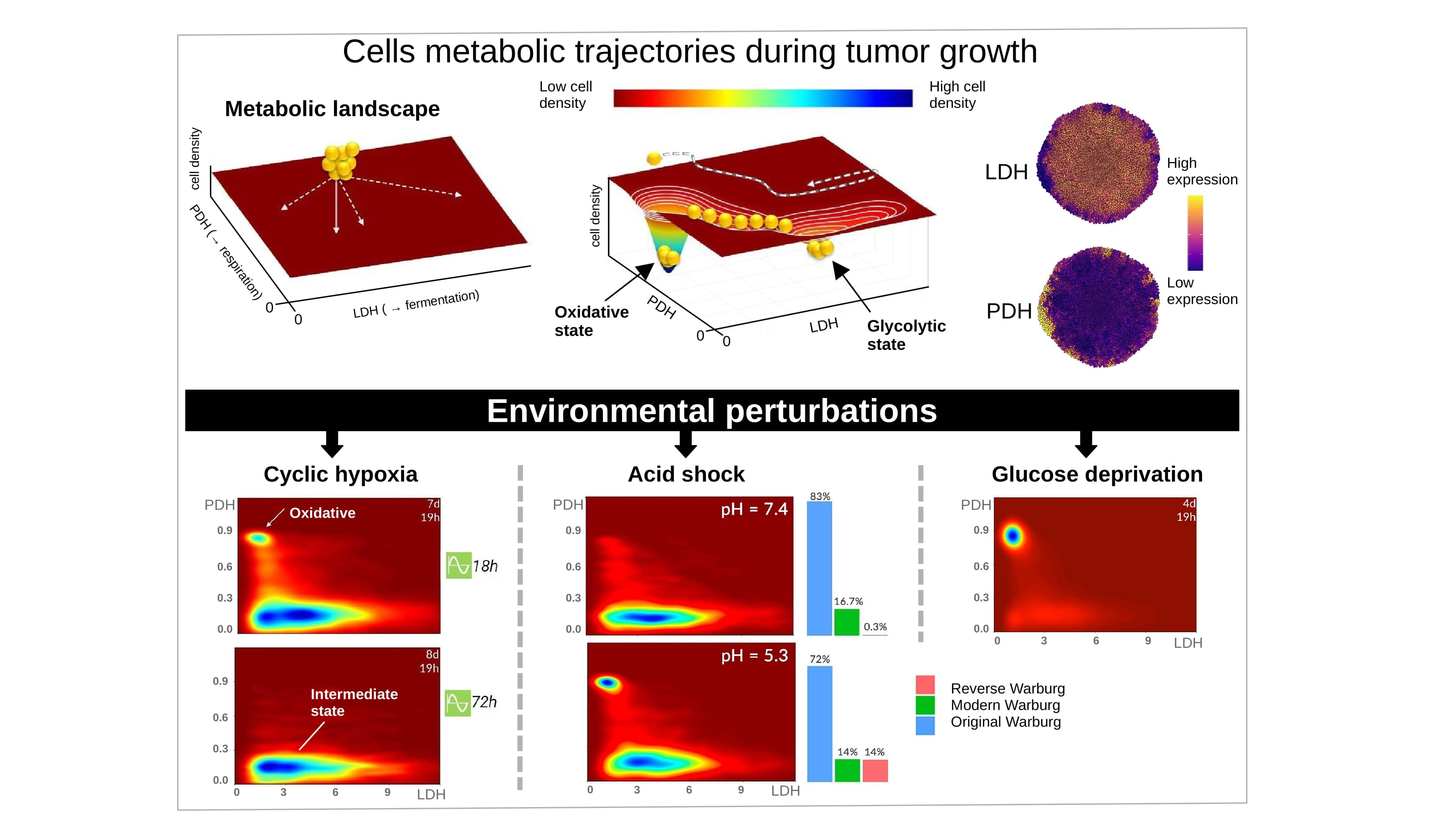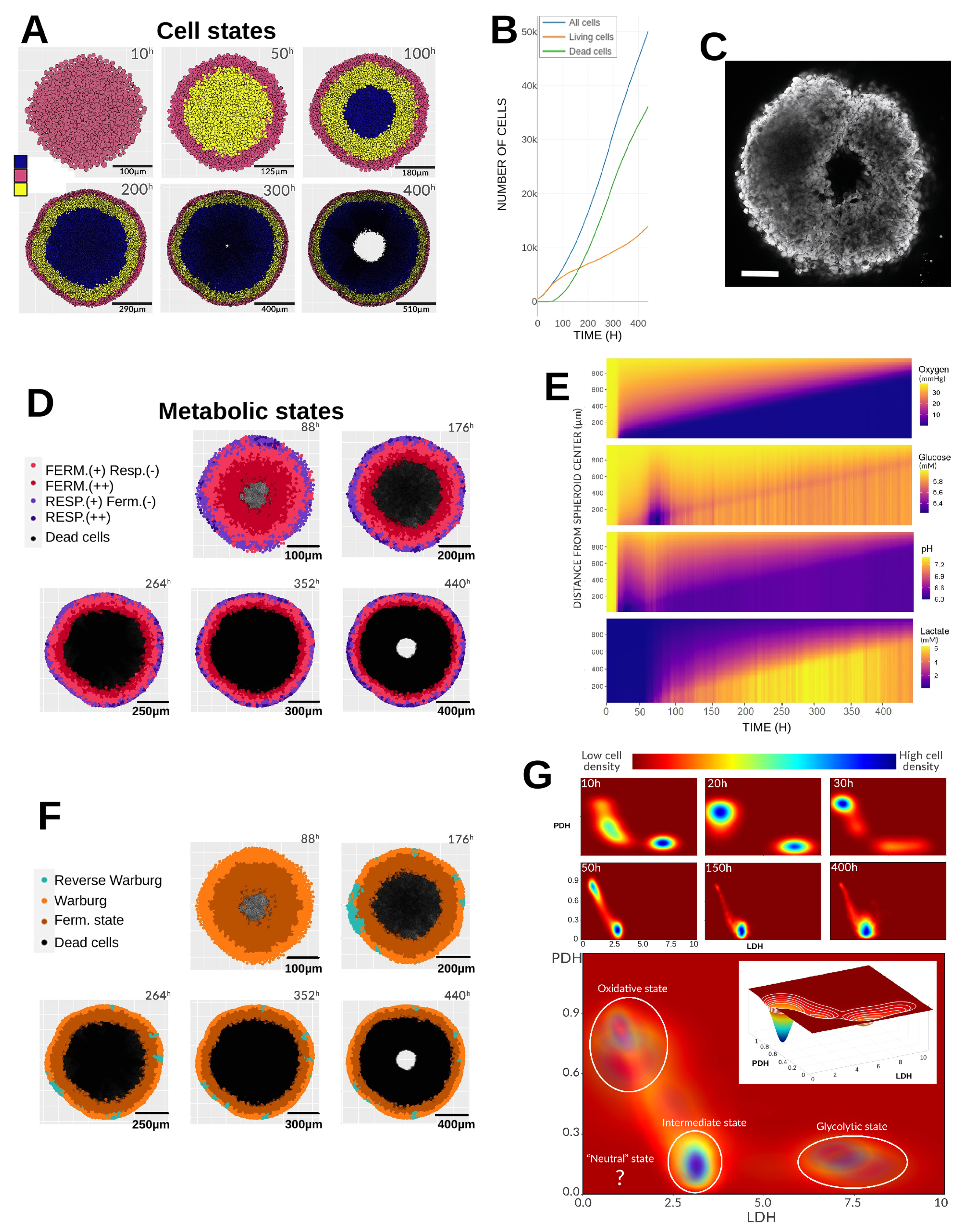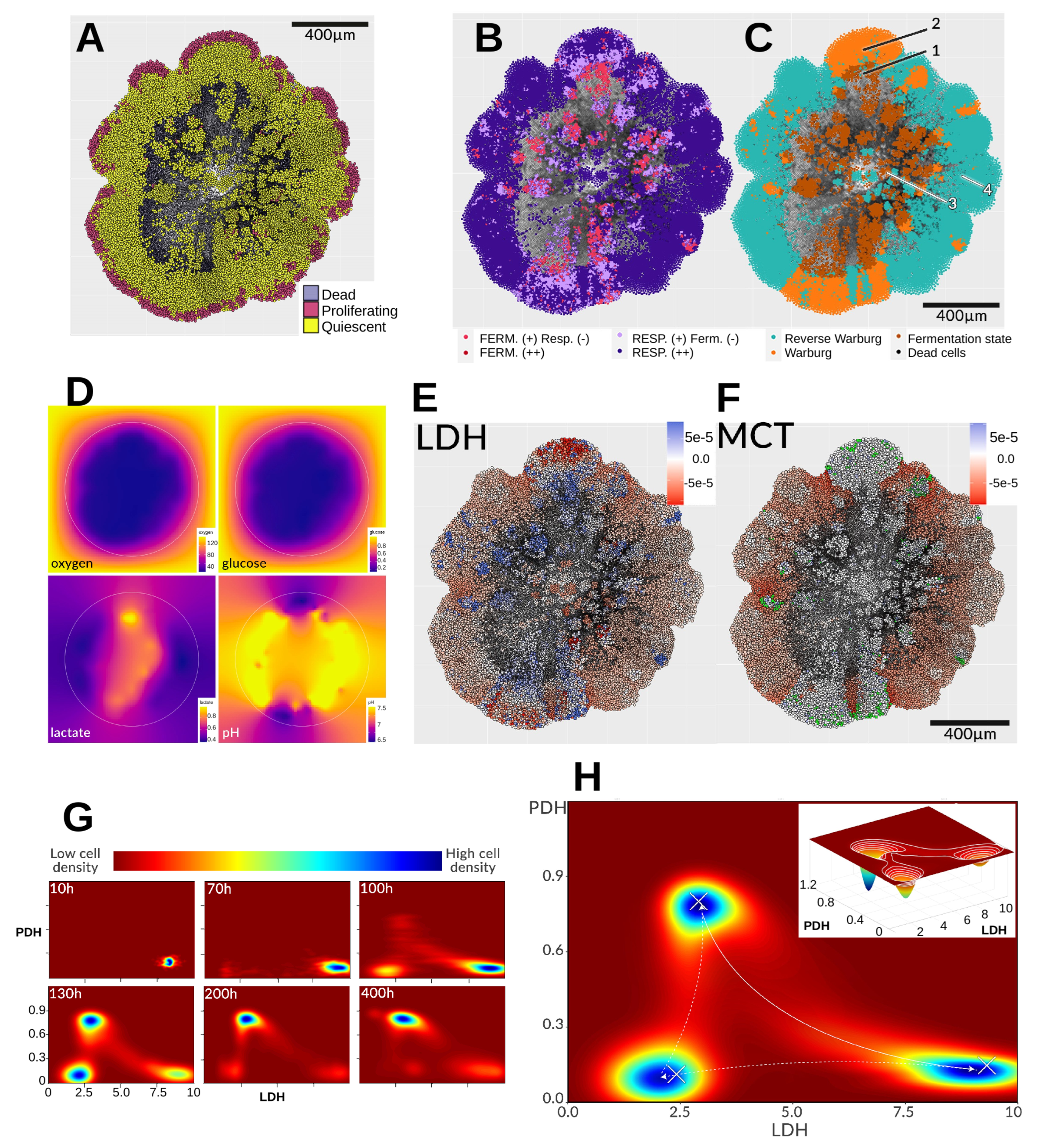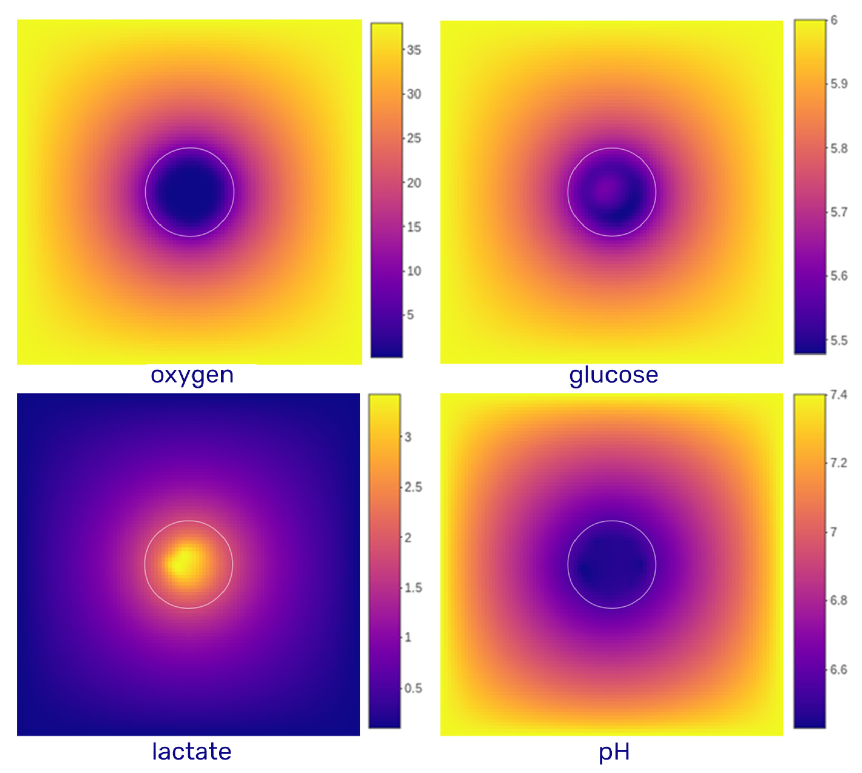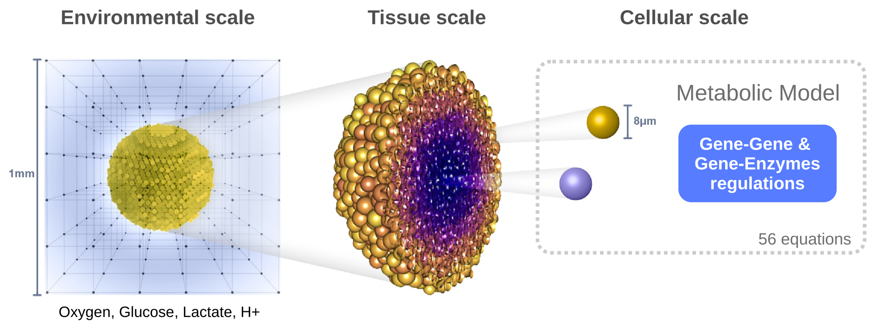 - Environmental scale: The extracellular medium is described using reaction–diffusion equations for four key species: oxygen, glucose, lactate, and protons (to evaluate pH). This level captures the spatiotemporal distribution of diffusible molecules.