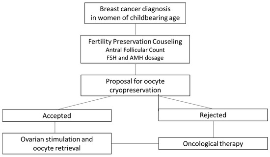 This prospective observational cohort study involved patients with breast cancer referred for fertility preservation counseling at a third-level, university-affiliated fertility center from November 2020 to May 2025. Women of childbearing age awaiting breast surgery at the Breast Unit of our institute were invited to participate in the study. As part of the diagnostic work-up at the Humanitas Cancer Center, the patients underwent a gynecological evaluation: during this visit, fertility preservation counseling was offered, and assessment of ovarian reserve [including pelvic ultrasound with antral follicle count (AFC) and serum levels of FSH and AMH] was prescribed. This assessment was conducted independently of the menstrual cycle phase. Patients who accepted the counseling were scheduled for a COS and oocyte cryopreservation. Ovarian reserve indices were measured before the initiation of COS, and all patients were evaluated and underwent fertility preservation procedures prior to the start of any oncologic treatment. Figure 1 shows the flowchart of the procedures.