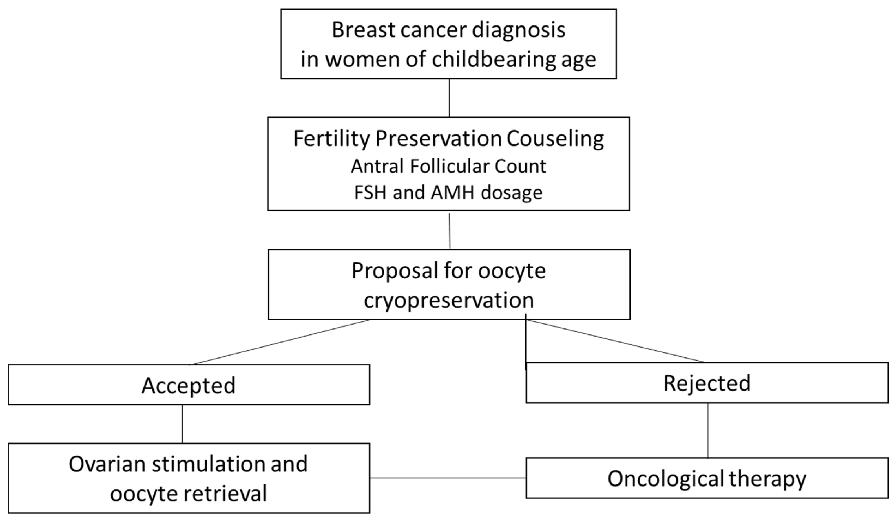 - Duraes, M.; Rathat, G.; Bringer-Deutsch, S.; Ranisavljevic, N.; Brouillet, S.; Defez-Fougeron, C.; Duflos, C. Fertility preservation in patients of childbearing age treated for breast cancer: A nationwide cohort study. Breast 2022, 64, 121–126. [Google Scholar] [CrossRef]