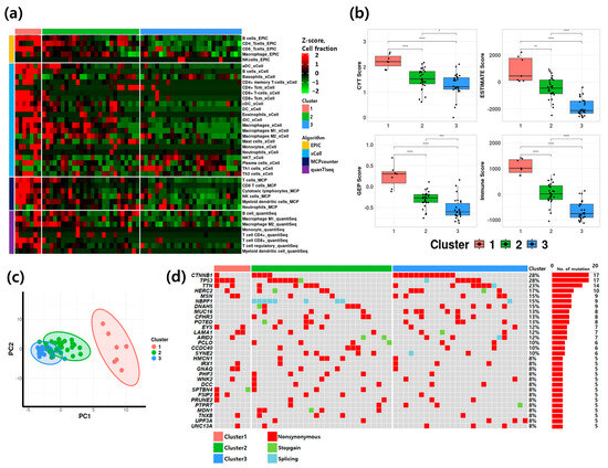 Comparison and characterization of sample groups stratified by immune microenvironment. (a) Complex heatmap illustrating the clustering results based on calculated immune scores. Sample-wise values were normalized using z-score scaling. * p < 0.05, ** p < 0.01, *** p < 0.001, **** p < 0.0001 (b) Boxplots showing differences in cytolytic activity (CYT) score, ESTIMATE score, gene expression profile (GEP) score, and immune score among the identified clusters. Statistically significant differences between groups were observed (p-value < 0.05 for all comparisons). (c) PCA plot illustrating the distribution of the 60 samples according to cluster assignment. (d) Oncoplot illustrating somatic mutations across clusters.