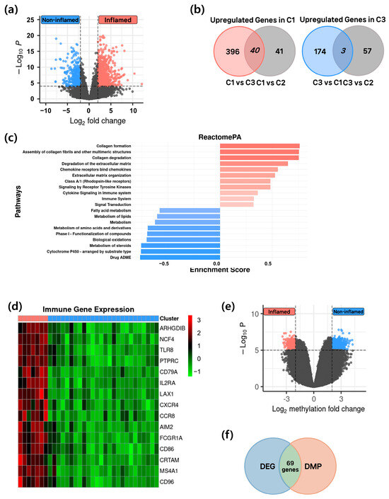 To investigate gene expression differences between groups with distinct immune microenvironments, Cluster 1 (the group with the highest immune activity, designated as the inflamed group) and Cluster 3 (the group with the lowest immune activity, designated as the non-inflamed group) were compared. Differentially expressed gene (DEG) analysis was performed to identify genes specifically and highly expressed in each group (Figure 3a; log2FC > 2, FDR < 0.001). DEG analysis across the three clusters revealed that 436 genes were highly expressed in the inflamed group, whereas 177 genes were highly expressed in the non-inflamed group (Figure 3b). Pathway enrichment analysis was then conducted using the Reactome database to identify biological pathways influenced by these highly expressed genes (Figure 3c). In the inflamed group, pathways related to collagen formation, collagen degradation, extracellular matrix (ECM) degradation, and immune system function were enriched. In contrast, pathways associated with lipid metabolism and steroid metabolism were predominant in the non-inflamed group, clearly distinguishing the immune-active and immune-suppressed states. Next, we assessed the expression of immune-related genes between the two groups (Figure 3d). Expression of immune-related genes was markedly reduced in the immune-suppressed, non-inflamed group, whereas these genes were robustly expressed in the inflamed group. To identify genes highly expressed in both groups and potentially regulated by epigenetic modifications, differentially methylated probe (DMP) analysis was performed (Figure 3e,f; log2FC > 2, FDR < 0.001). Probes showing significant methylation differences were mapped to the corresponding genes, and for each gene the probe with the lowest p-value was selected. This analysis identified 69 genes whose expression levels were strongly influenced by DNA methylation in both groups, indicating tight epigenetic regulation (Figure 3f).