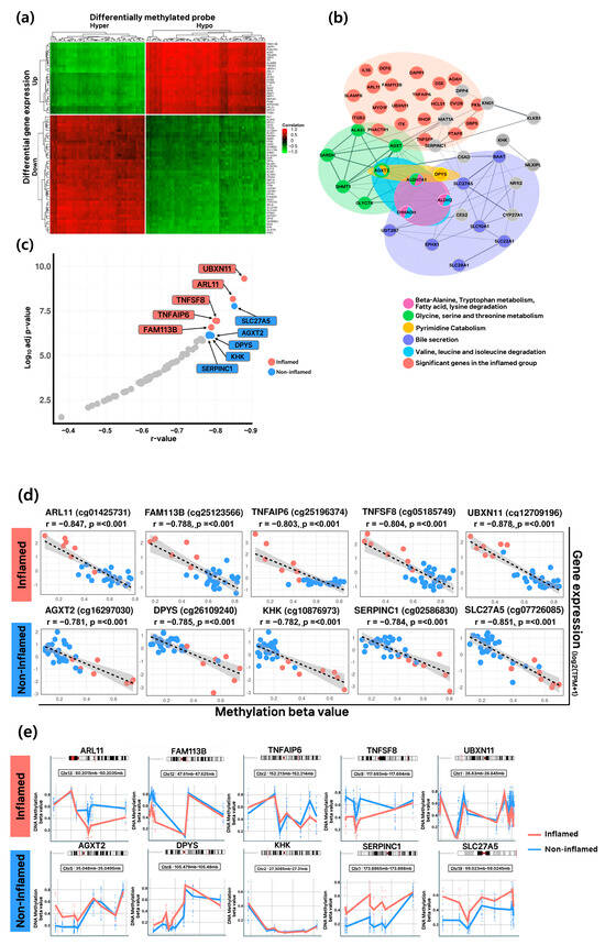 Selection of the most significant epigenetic–transcriptomic regulated genes between the inflamed and non-inflamed groups. (a) Heatmap illustrating the correlation between expression levels and β-values for significant genes identified in both DEG and DMP analyses. (b) Network analysis plot illustrating the functional roles of the 69 genes, with hub genes highlighted. (c) Scatter plot showing the negative correlation between gene expression and probe methylation. (d) Scatter plots illustrating the correlation between gene expression levels and β-values for the selected candidate marker genes across samples. (e) Plot illustrating the methylated regions of candidate marker genes, indicating the chromosomal locations and methylated CpG sites for each gene.