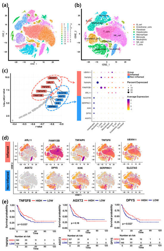 To investigate the expression patterns of candidate genetic markers at the single-cell level, a single-cell transcriptome dataset (GSM8825751, comprising 12 samples) was utilized. Clustering analysis of 140,501 cells identified 21 distinct clusters, with T cells, NK cells, and hepatocytes constituting the largest proportions (Figure 5a,b; Supplementary Figure S3a–c). The expression of the ten candidate marker genes, selected from the inflamed and non-inflamed groups, was examined across these cell types (Figure 5c). As expected, ARL11, FAM113B, TNFAIP6, TNFSF8, and UBXN11 were predominantly expressed in immune cells such as neutrophils, T cells, NK cells, macrophages, and monocytes. In contrast, AGXT2, DPYS, KHK, SERPINC1, and SLC27A5 were mainly expressed in hepatocytes. Among these, FAM113B and TNFSF8 showed broad and high expression across immune cells, while AGXT2, DPYS, and SERPINC1 exhibited increased expression in hepatocytes (Figure 5d). Ultimately, AGXT2, DPYS, and TNFSF8 were selected as HCC-specific epigenetic–transcriptomic gene markers that reflect significant differences in the tumor microenvironment, exhibiting distinct cell type specificity. To evaluate their clinical relevance, disease-free survival analysis was performed (Figure 5e). Higher expression of TNFSF8, predominantly expressed in the inflamed group, was associated with increased immune activity and improved patient prognosis (p = 0.037). Similarly, elevated expression of AGXT2 and DPYS, primarily expressed in the non-inflamed group, correlated with better prognosis (p = 0.18 and p = 0.027, respectively). These findings suggest that enhanced pyrimidine catabolism and amino acid metabolism mediated by these genes contribute to tumor suppressive effects (Figure 3c and Figure 4b).