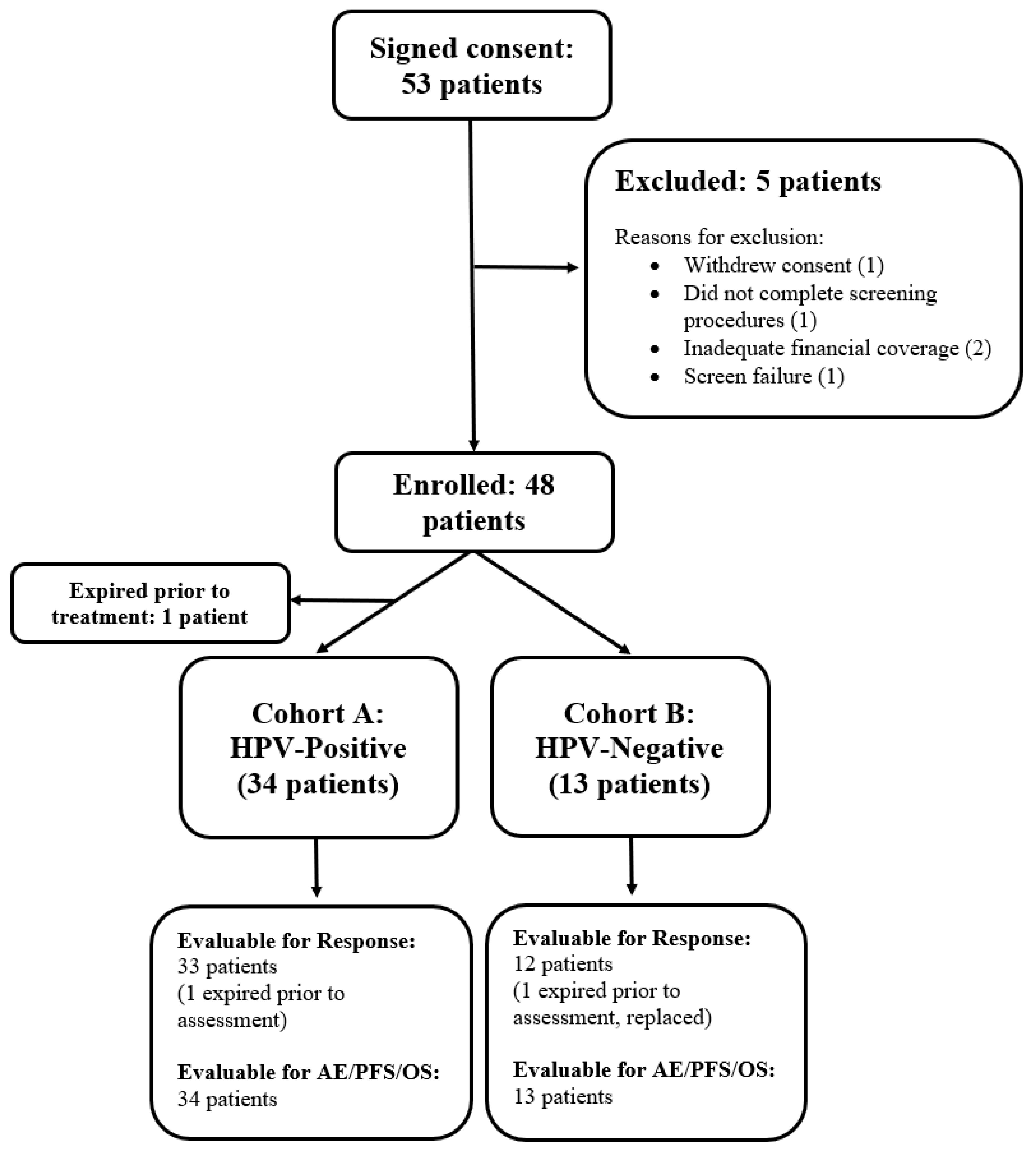 | Characteristic | Cohort A: HPV-Positive (n = 34) | Cohort B: HPV-Negative (n = 13) |