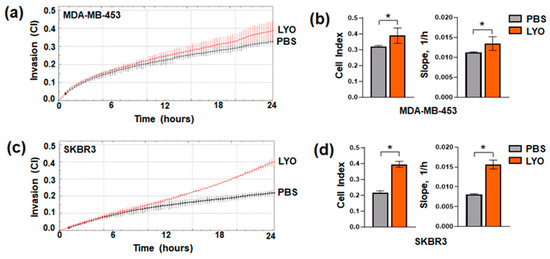 Tumor metastases are a significant concern and one of the leading causes of morbidity for patients with HER2+ cancers [39,40]. To investigate whether garlic extract modulates invasive capability of HER2+ breast tumor cells, both cell lines were treated with LYO for 72 h and subjected to real-time analysis with xCELLigence RTCA technology. As reported in Figure 2, the assay revealed that the two cell lines intrinsically possess low invasive capability in vitro. After treatment with garlic extract, unlike what we observed in other breast tumor phenotypes, both cell lines showed an unexpected increase in their invasive capability, with SKBR3 (Figure 2c,d) more responsive than MDA-MB-453 cells (Figure 2a,b).