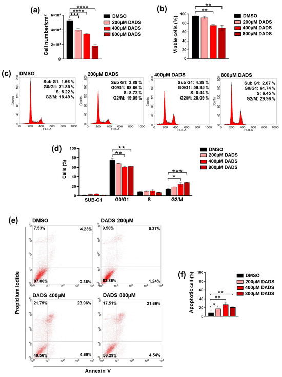 Effects of DADS on cell growth and apoptosis in SKBR3 cells. After treatment for 72 h with DADS at the indicated concentrations, cells were subjected to evaluation of proliferation (a), viability (b), cell cycle distribution (c,d), and apoptosis (e,f). Data represents the mean of the three separate experiments ± SD. * p < 0.05; ** p < 0.01; *** p < 0.001; **** p < 0.0001 compared to the control (DMSO).