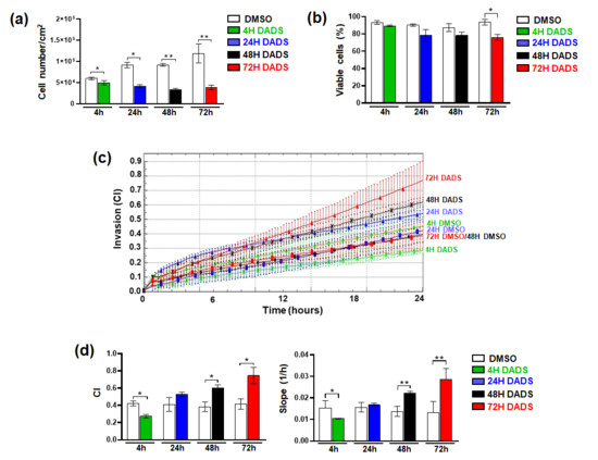 Effects of treatment duration with DADS of SKBR3 cells. Cells cultured in control conditions (DMSO) or treated with 400 µM DADS for the indicated times were subjected to evaluation of cell growth (a,b) and invasive capabilities (c). The analysis of cell index (CI) at 24 h of the assay, and of the slope is also reported (d). Data represents the mean of the three experiments ± SD. * p < 0.05; ** p < 0.01 compared to the control.