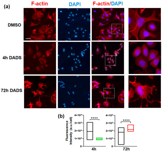 To invade and metastasize, breast cancer cells must breach the basement membrane and then penetrate the dense extracellular environment of the mammary tissue [43]. To assess whether the peculiar effects of DADS on invasive capability of SKBR3 cells are accompanied by a substantial modification of cell morphology, we investigated actin polymerization, a crucial event in cancer cells, as the plasticity of the actin cytoskeleton is fundamental for cell migration, extracellular matrix invasion, and metastatic dissemination [44,45]. As reported in Figure 6a, in control cells, immunofluorescence for F-actin shows organization into well-defined stress fibers, structures that are crucial for maintaining cell shape and adherents’ junctions [46]. A brief treatment (4 h) with DADS induced a marked reorganization of the actin cytoskeleton, with loss of fibers in favor of a more diffuse and punctuated actin pattern (Figure 6a), indicative of depolymerization or dynamic redistribution of actin filaments. Conversely, after 72 h of DADS administration, the formation of new and more robust F-actin structures was revealed (Figure 6a), such as enhanced lamellipodia and filopodia, which are necessary to support the mesenchymal phenotype and increased cell motility [44,45,47]. Quantitative analysis of F-actin fluorescence intensity (Figure 6b) substantiated these morphological observations. A significant decrease in F-actin intensity was found after 4 h of treatment, consistent with the cytoskeletal disorganization that characterizes decreased motility, while a notable increase in total F-actin intensity per cell was recorded after 72 h, consistent with the morphological changes that describe increased invasive potential. Overall, the profound alterations observed in F-actin cytoskeleton organization, coupled with the modulation of its quantity, are highly consistent with the modification of invasive properties induced by DADS in this breast tumor cell model.