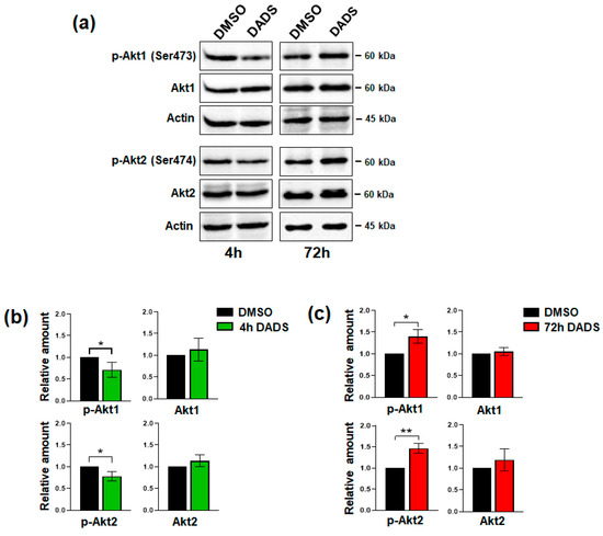 Effect of DADS on Akt status in SKBR3 cells. (a) Representative immunoblot analysis with the indicated antibodies of total lysates from SKBR3 cells after 4 and 72 h of culture in control conditions (DMSO) or in the presence of 400 µM DADS. Histograms, as deduced from the densitometry of Western blot bands normalized to actin, are shown (b,c). Data represents the mean of the three independent experiments ± SD. * p < 0.05; ** p < 0.01 compared to the control conditions taken as 1. The uncropped blots are shown in Supplementary File S1.