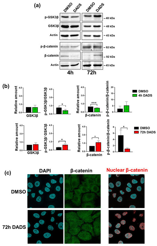 Effect of DADS on p-GSK3β/β-catenin status in SKBR3 cells. (a) Representative immunoblot analysis with the indicated antibodies of total lysates from SKBR3 cells after 4 and 72 h of culture in control conditions (DMSO) or in the presence of 400 µM DADS. Histograms, as deduced from the densitometry of Western blot bands normalized to actin are shown in (b). Data represents the mean of the three experiments ± SD. * p < 0.05; *** p < 0.001 compared to the control cells taken as 1. In (c), representative confocal images of SKBR3 cells treated with DADS for 72 h and stained with the antibody against β-catenin (green). DAPI was used to counterstain the nucleus (blue). On the right, the overlap of nuclear β-catenin (red points) with nuclei (blue) is shown. Magnification = 63×. The uncropped blots are shown in Supplementary File S1.