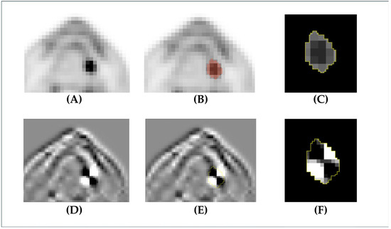 A case of early-stage (T1N0) cancer of the left tongue. In the PET image, regions with high FDG uptake are represented in black, and the lesion is identified as a black area (A). Based on image (A), tumor segmentation was performed using an SUV threshold of 2.5, resulting in image (B). The final segmented tumor region is shown in image (C). Image (D) is a wavelet-transformed version of image (A), which is used for radiomic feature extraction. Image (E) shows the tumor region segmented on the wavelet-transformed image (D), and the final segmented region is presented in image (F).